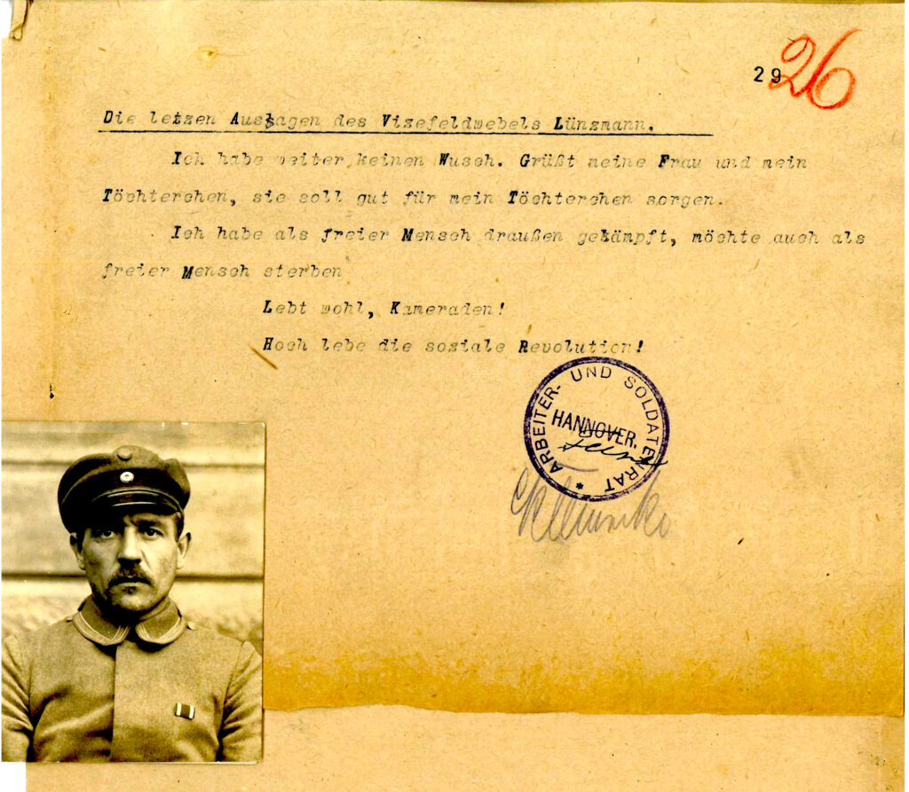 In der Akte sind „Die letz(t)en Aussagen des Vizefeldwebels Lünzmann“ wiedergegebenen und werden hier samt Foto des Verurteilten abgebildet: „Ich habe weiter keinen Wunsch. Grüßt meine Frau und mein Töchterchen, sie soll für mein Töchterchen sorgen. Ich habe als freier Mensch draußen gekämpft, möchte auch als freier Mensch sterben. Lebt wohl, Kameraden! Hoch lebe die soziale Revolution.“