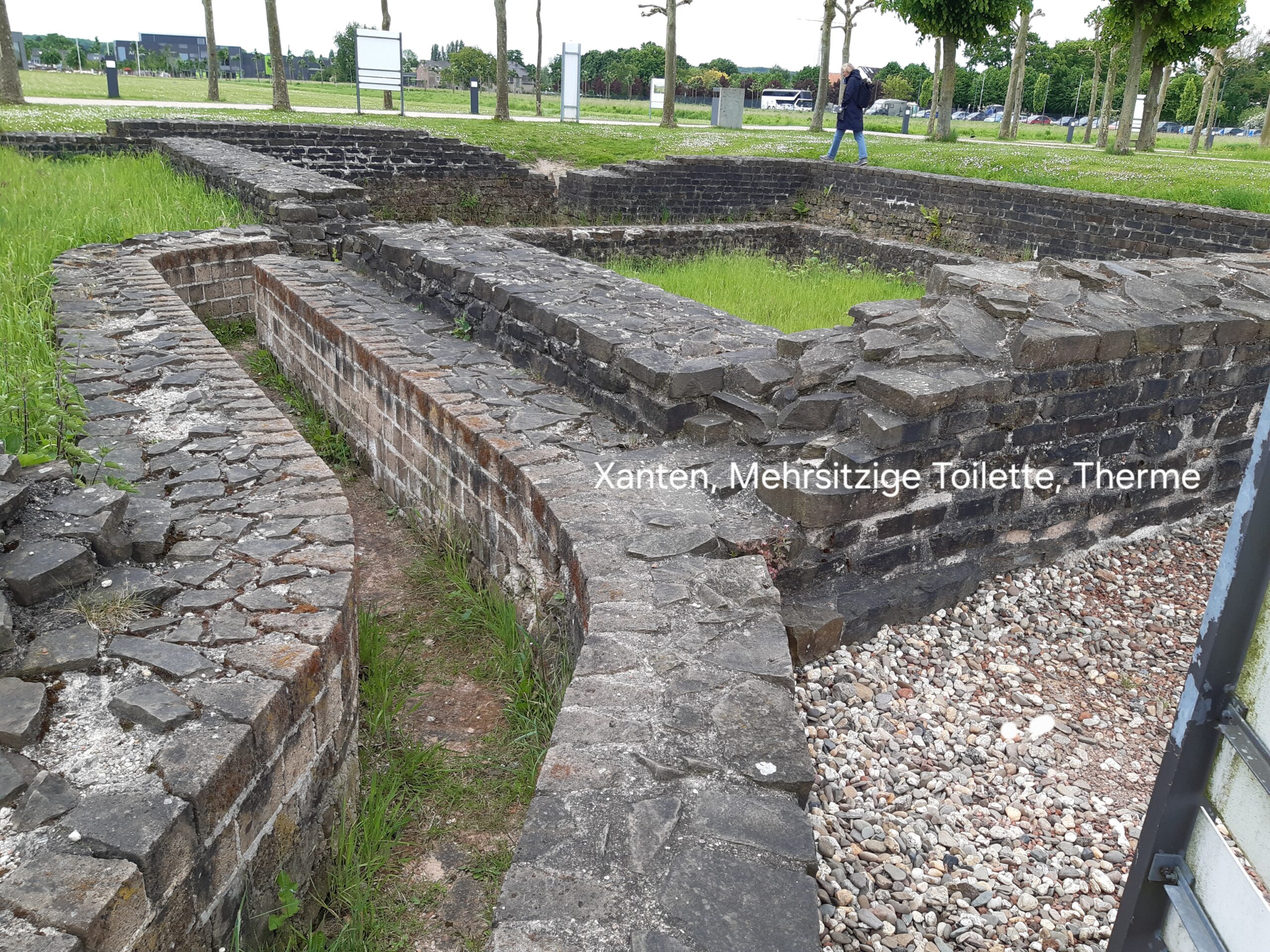 Obiges Bild: Grundriss einer mehrsitzigen Latrine der Therme in der Colonia Ulpia Traiana (Xanten, APX). Im Vordergrund der Kanal für die Zuleitung von Brauchwasser.